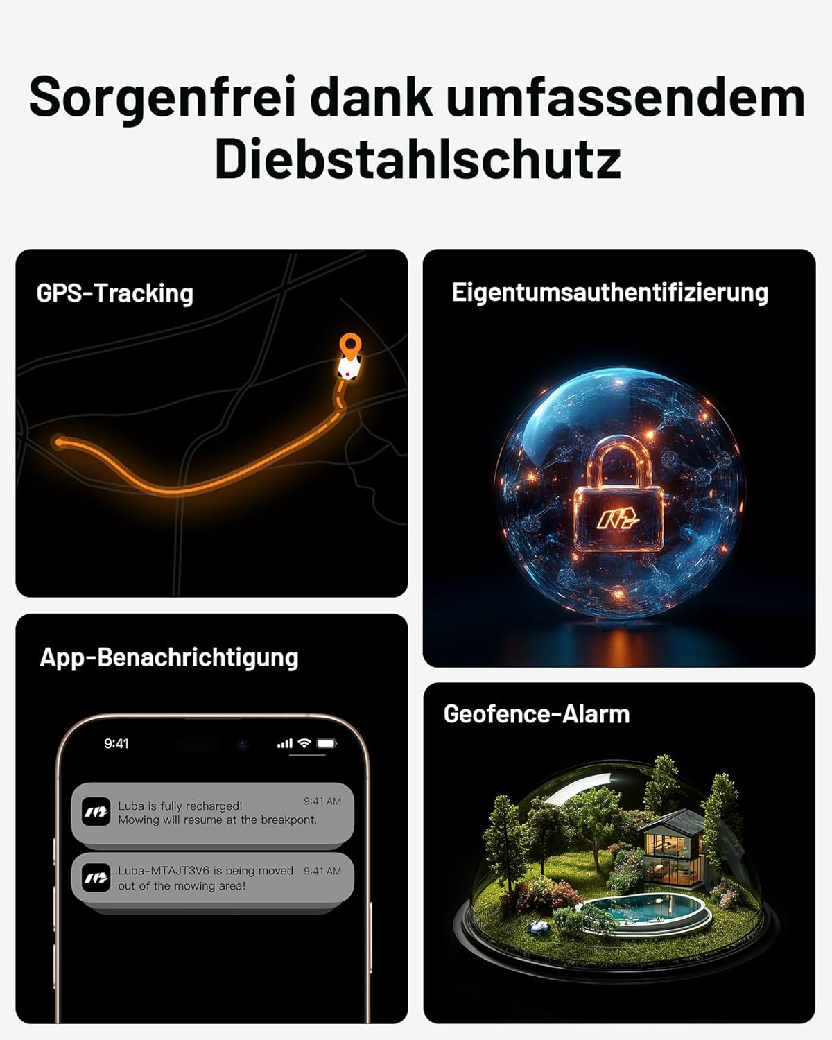 - Maximale Sicherheit bei der Rasenpflege: LUBA 2 AWD kombiniert visuelle Erkennung, Ultraschallradar und physikalische Sensoren für fortschrittliche Hindernisvermeidung. Die optimale Sensoranordnung eliminiert tote Winkel und bietet dreifachen Schutz für Familie, Haustiere und Wildtiere. Bewegliche Hindernisse wie Eichhörnchen und Igel werden intelligent erkannt, und sanfte Umgehungsrouten sorgen für maximale Sicherheit während des Betriebs